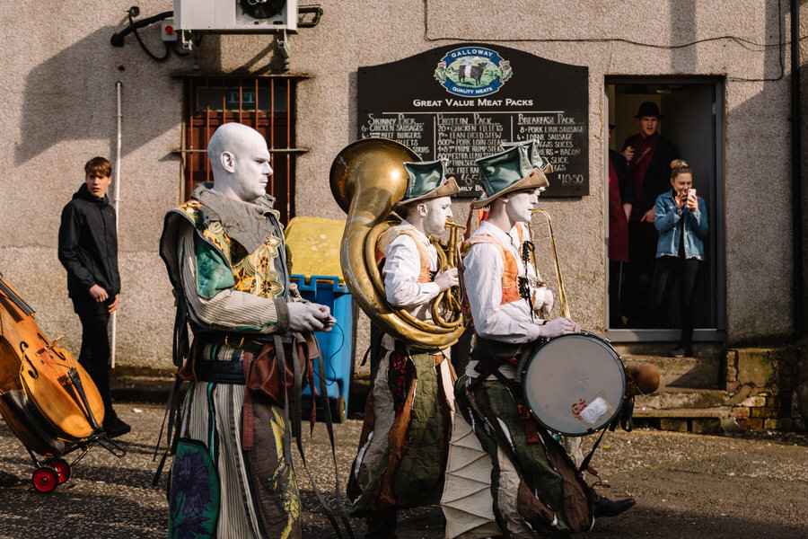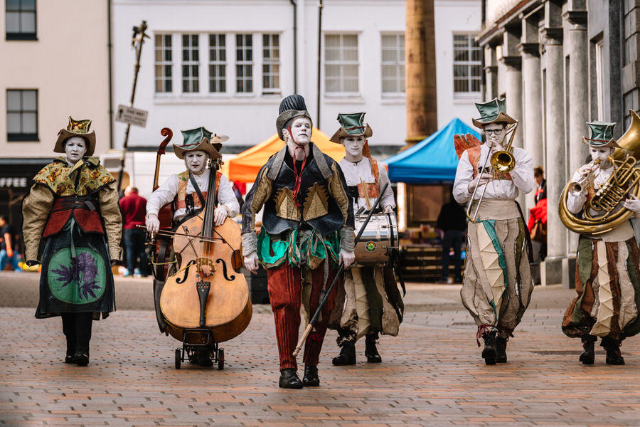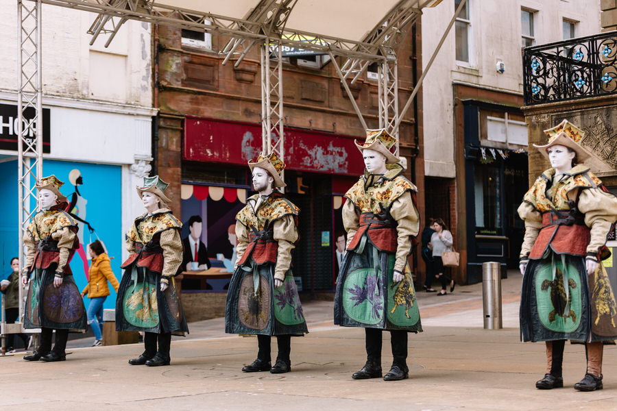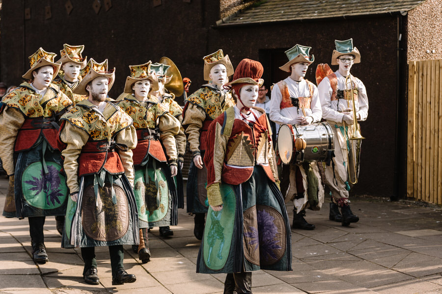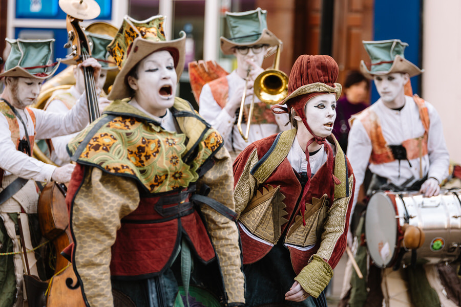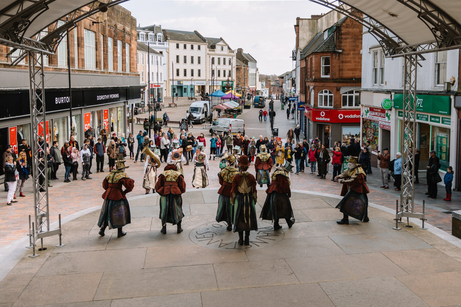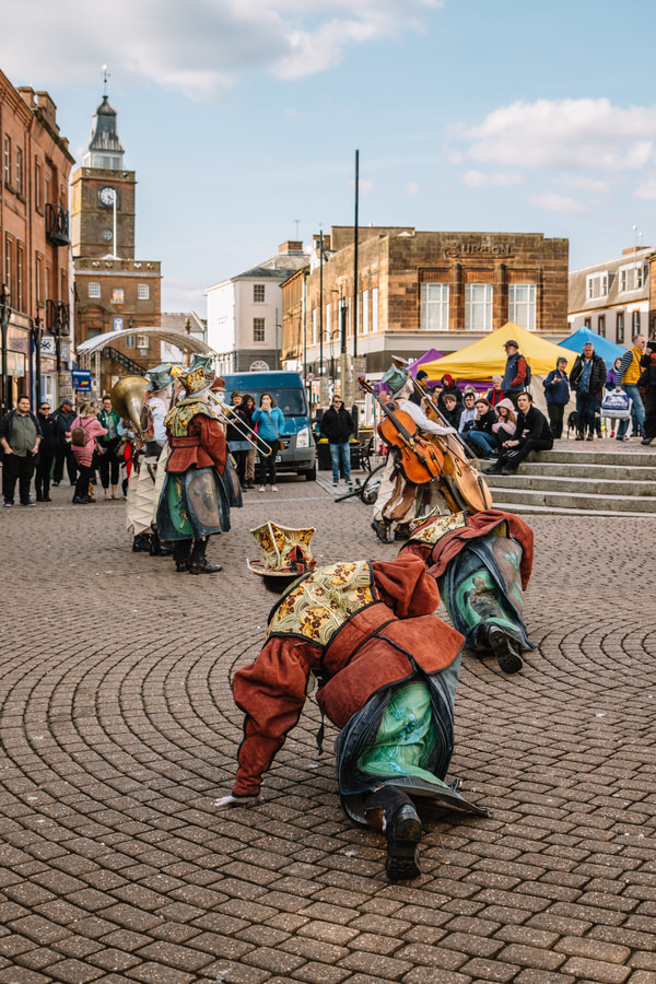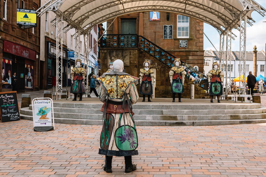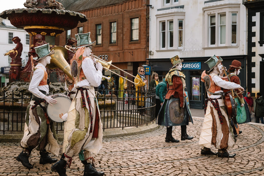 Orographic, a fusion of carnival street theatre, eccentric moves and live music, as performed by Oceanallover on Dumfries High Street. Bold costume designs by Alex Rigg, inspired by Charles Rennie Mackintosh’s paintings.