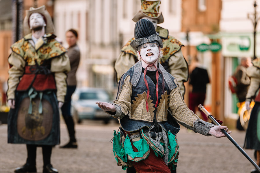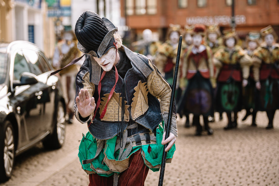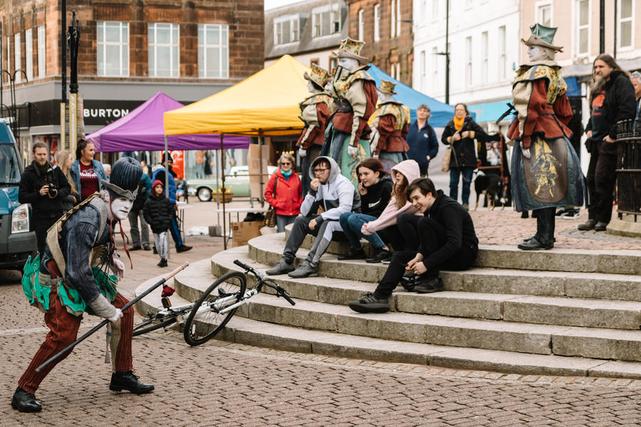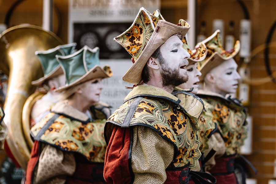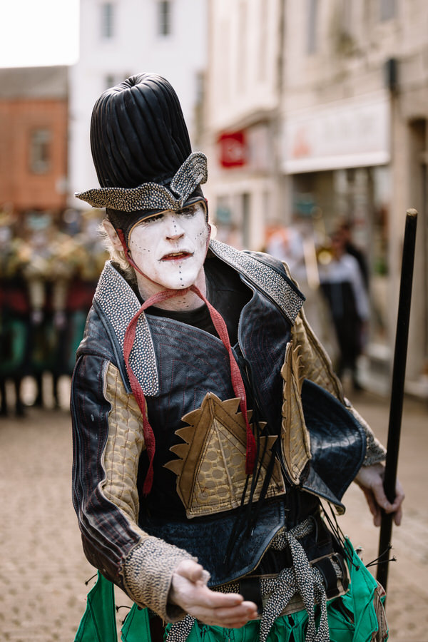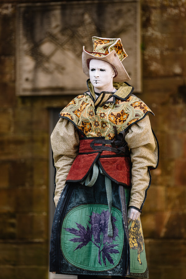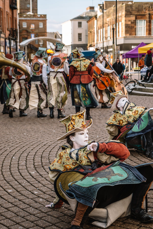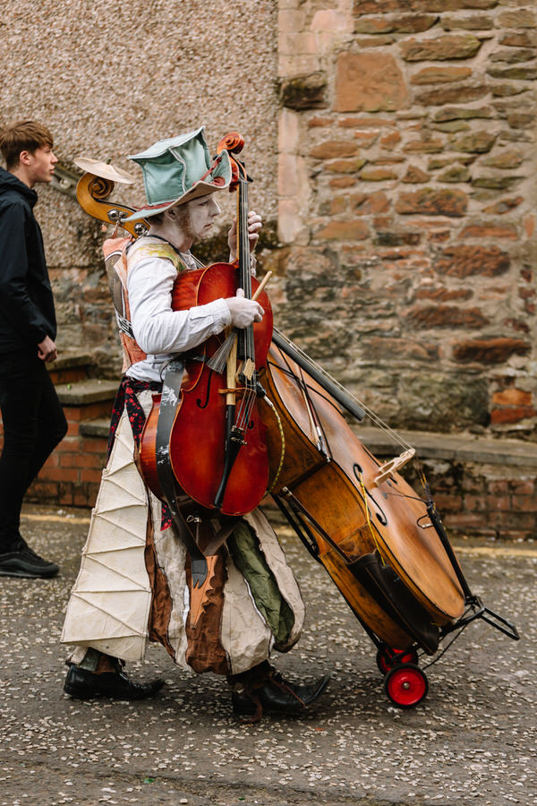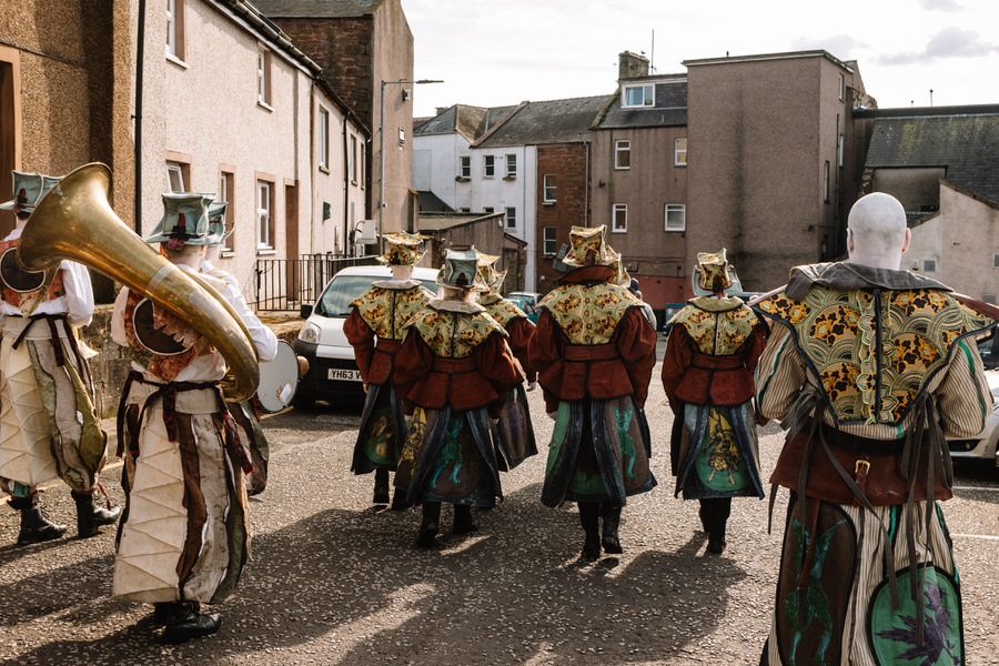 Orographic, a fusion of carnival street theatre, eccentric moves and live music, as performed by Oceanallover on Dumfries High Street. Bold costume designs by Alex Rigg, inspired by Charles Rennie Mackintosh’s paintings.