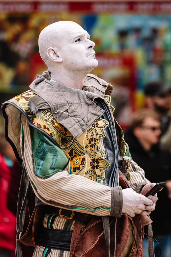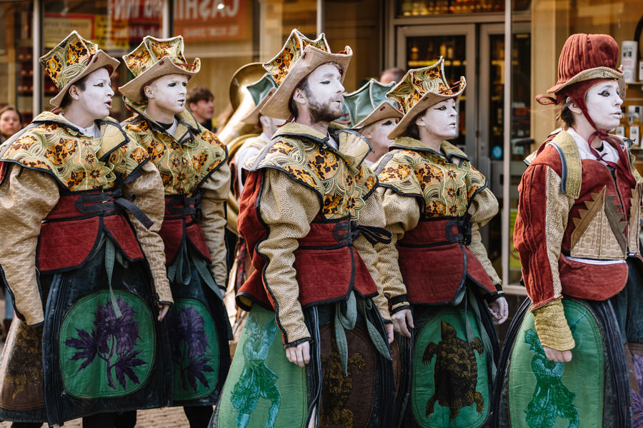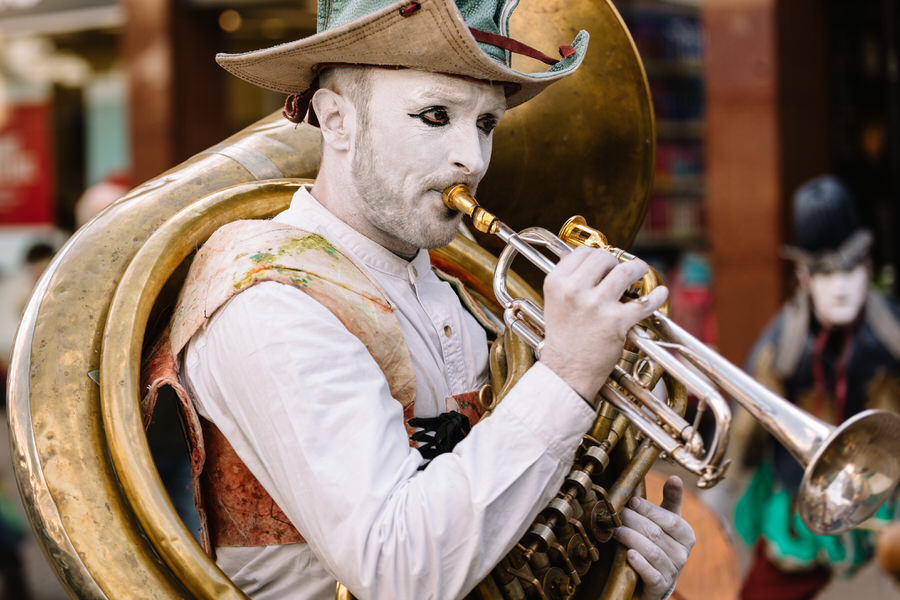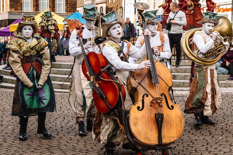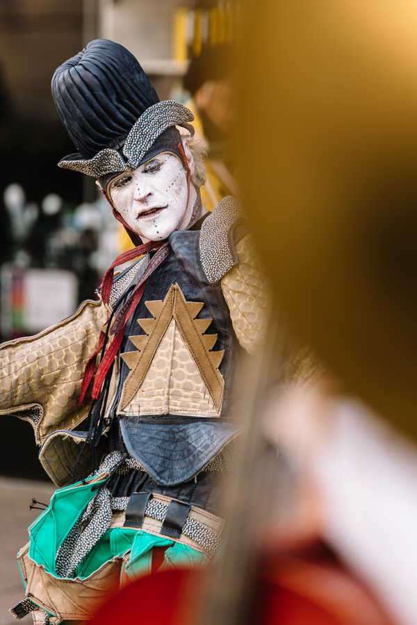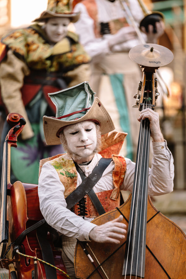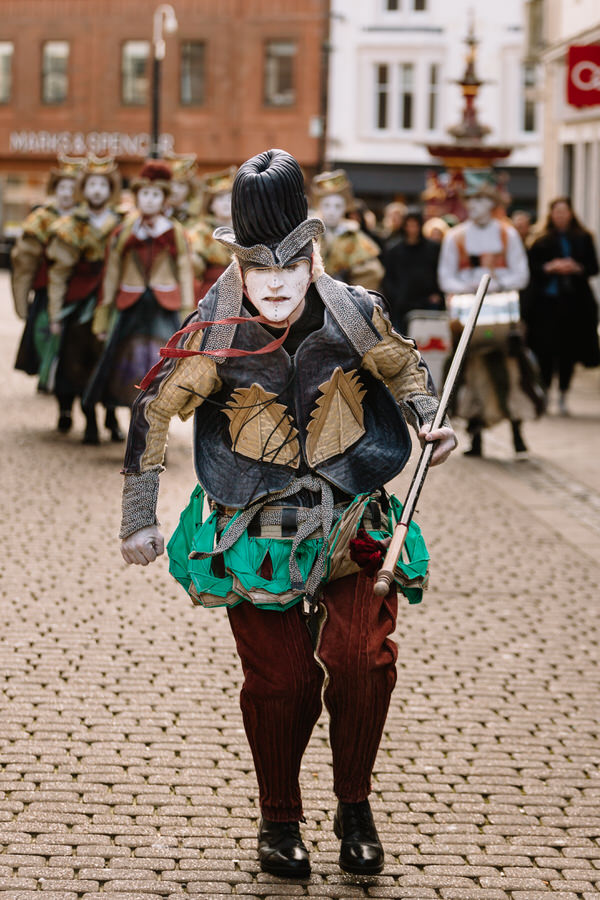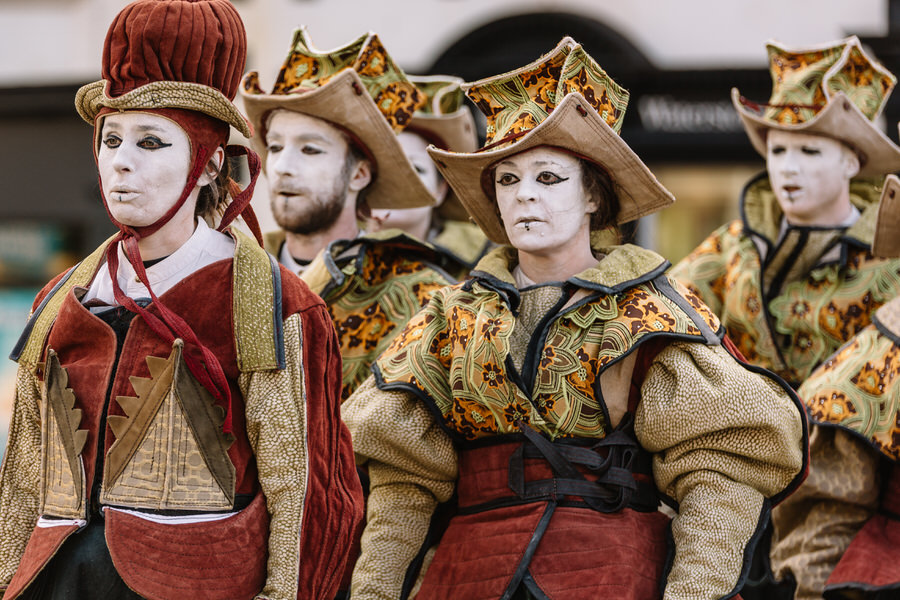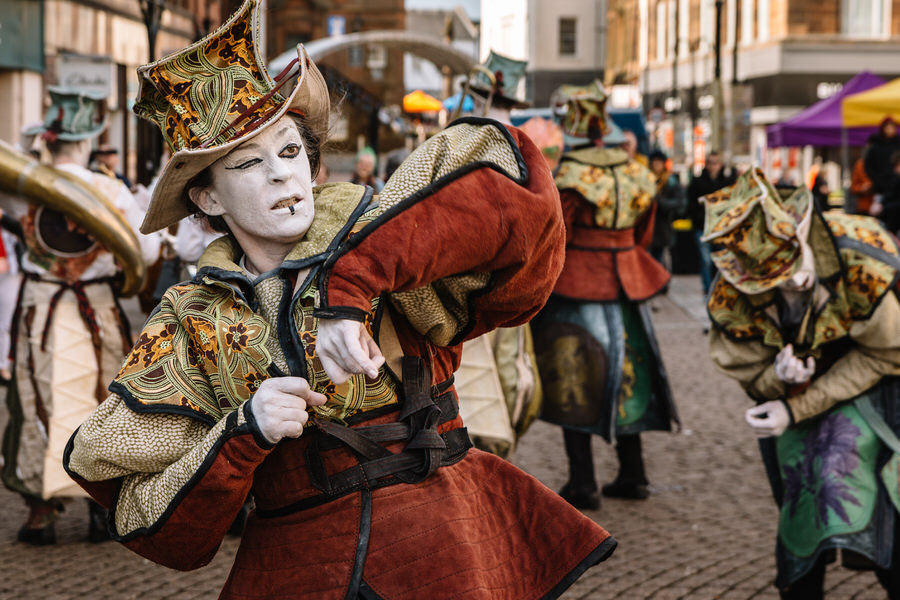 Orographic, a fusion of carnival street theatre, eccentric moves and live music, as performed by Oceanallover on Dumfries High Street. Bold costume designs by Alex Rigg, inspired by Charles Rennie Mackintosh’s paintings.