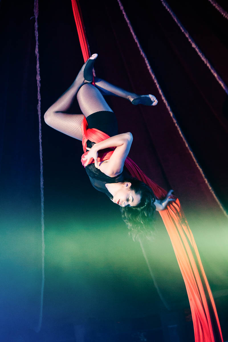 Leyla Rees from Starfiz aerial duo performs at Spiegeltent