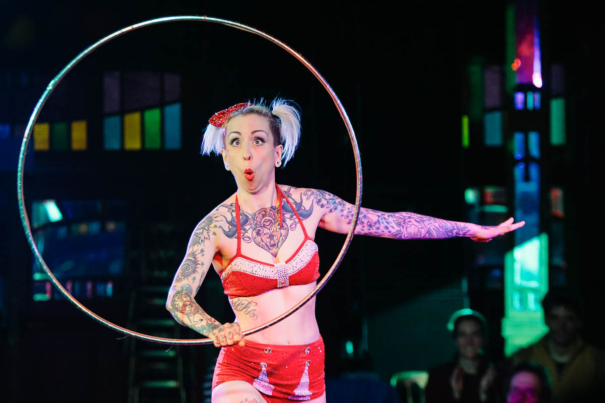 Chi Chi Revolver during her cabaret hula hoop demonstration in Spiegeltent