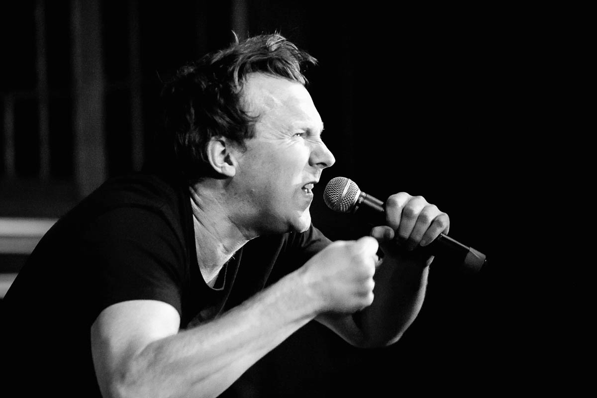 Jason Byrne, a stand up comedian from Ireland, delivers a joke to Doonhamers
