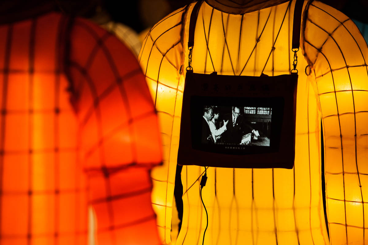 Black and white video displays on the chest of some terracotta warrior lanterns, part of the Festival of Light