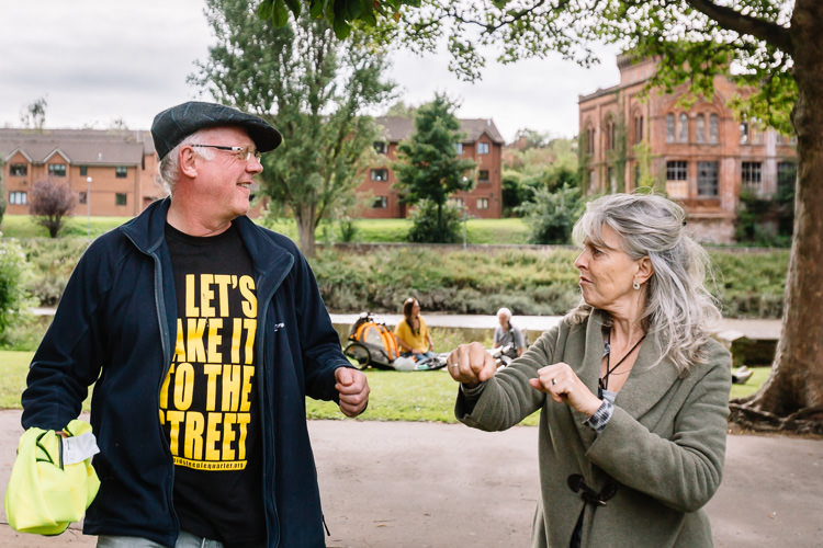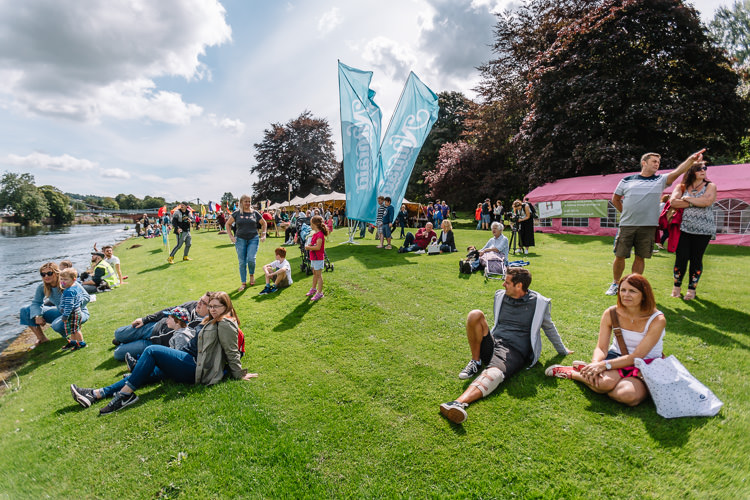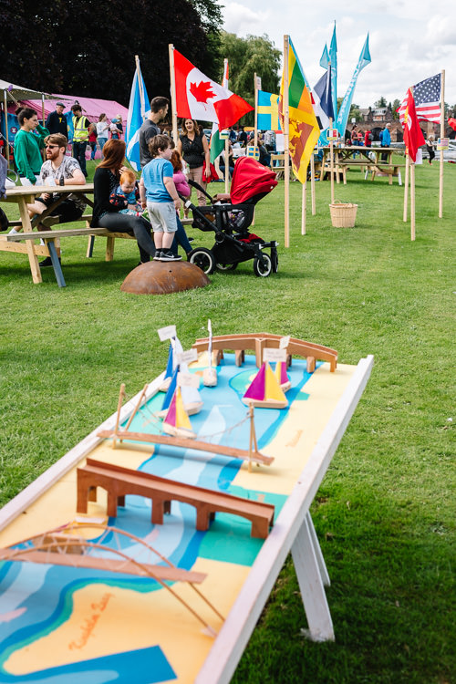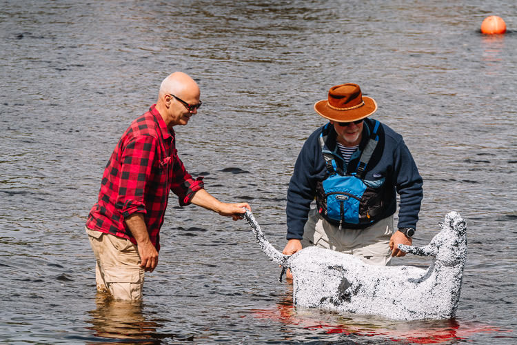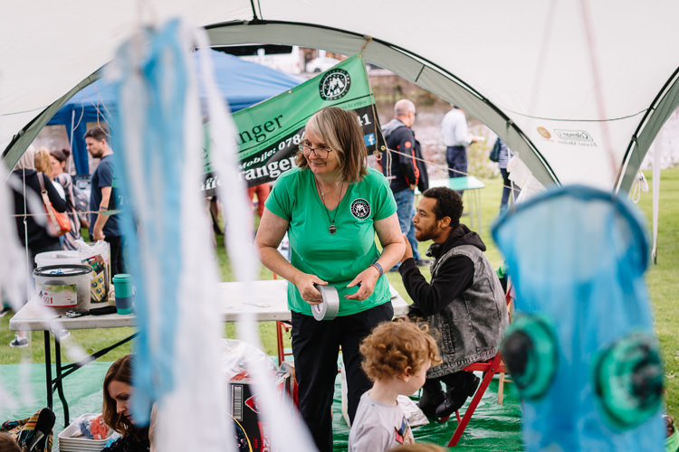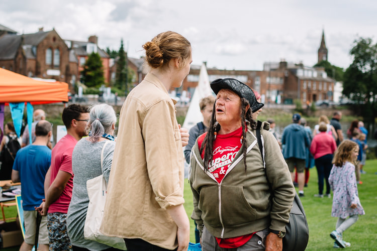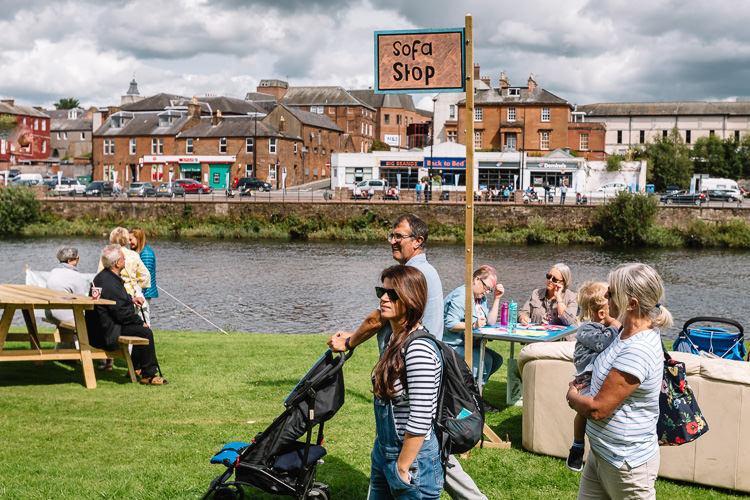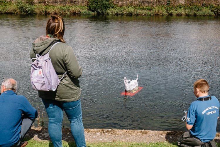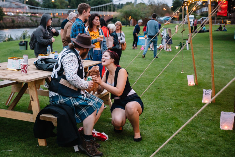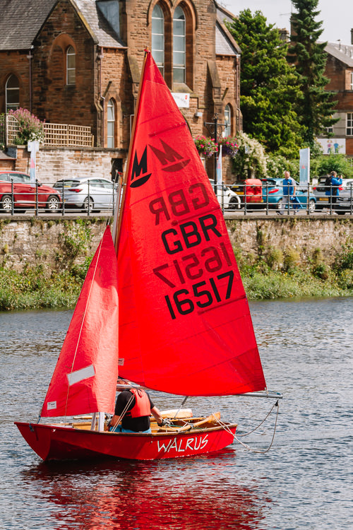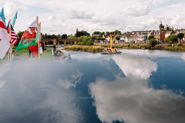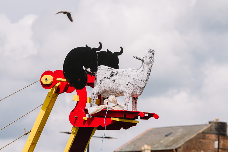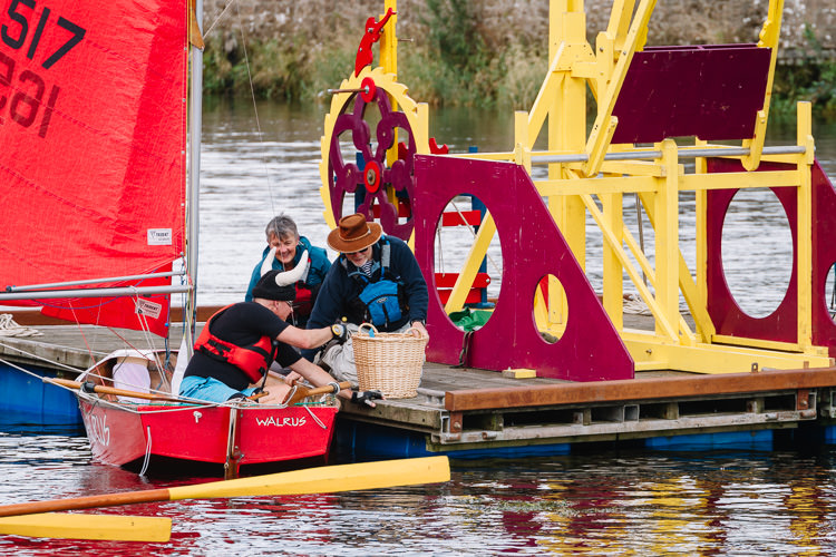 There were lots of creative workshops for kids – stone carving, zine and mosaic making, upcycling and Chinese lantern making. Local community groups had an opportunity top air their new projects and found recruits. Families could watch the races from Solway Firth up the river – one for sailing boats, the other for coastal rowing boats. Each boat delivered a symbolic cargo at the finishing line – the Salty Coo platform. Mark Zygadlo and a member of Alnmouth team won the respective races and the right to dunk the Coo into the Nith waters.