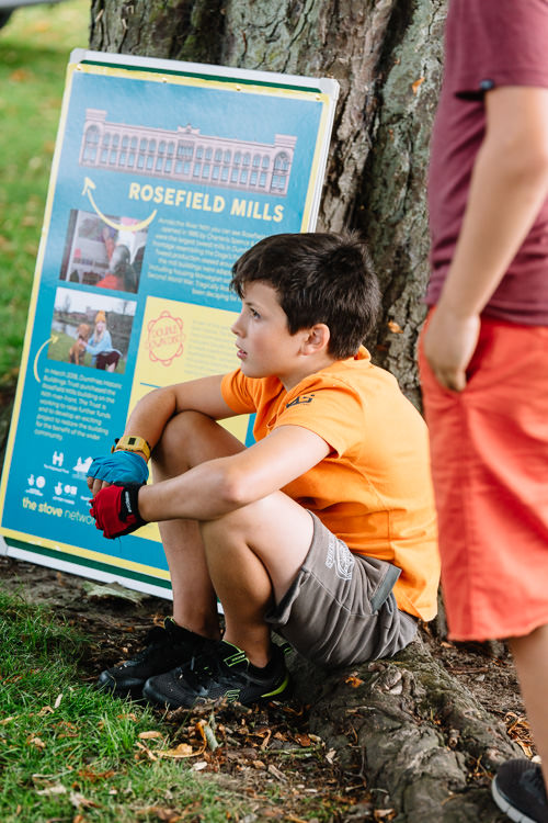 Boy near Rosefiled Mill board, celebrating the much loved landmark planned revival