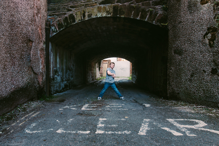 Lewis in a tunnel under Buccleuch Street for Urban Portraits Dumfries project