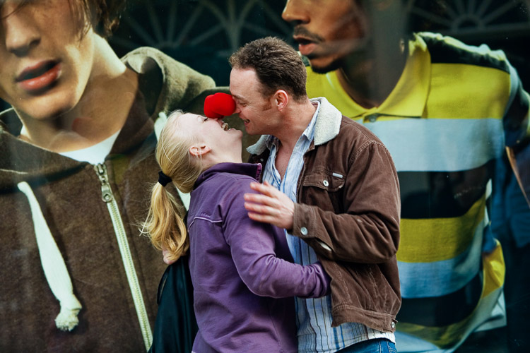A red nose day couple in front of a sports shop window