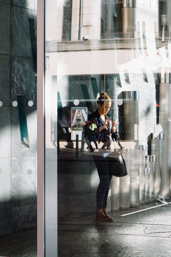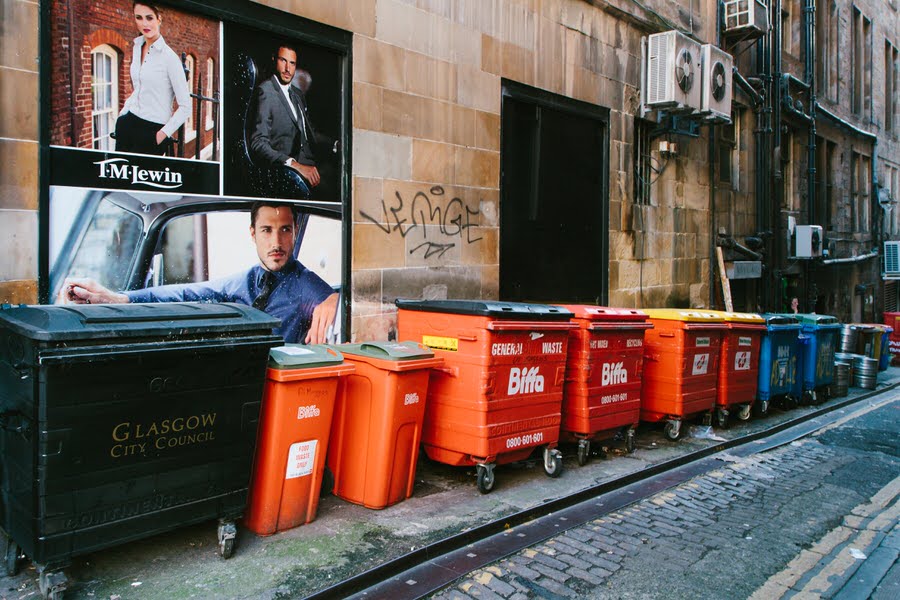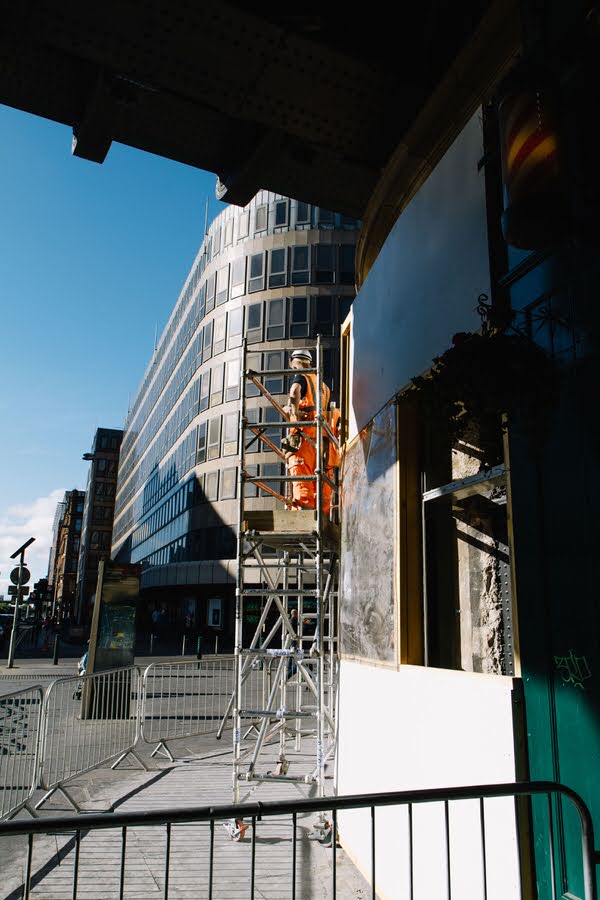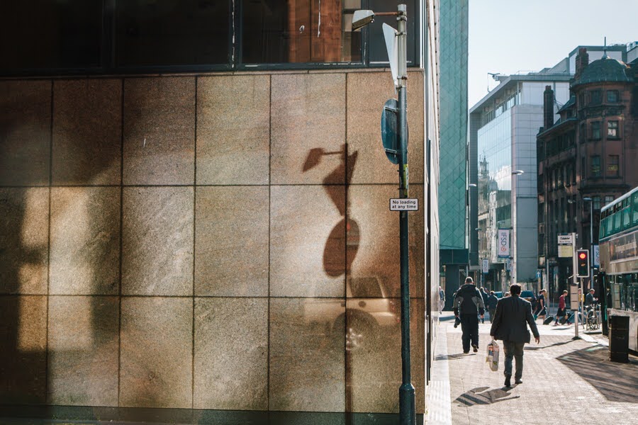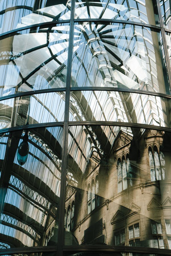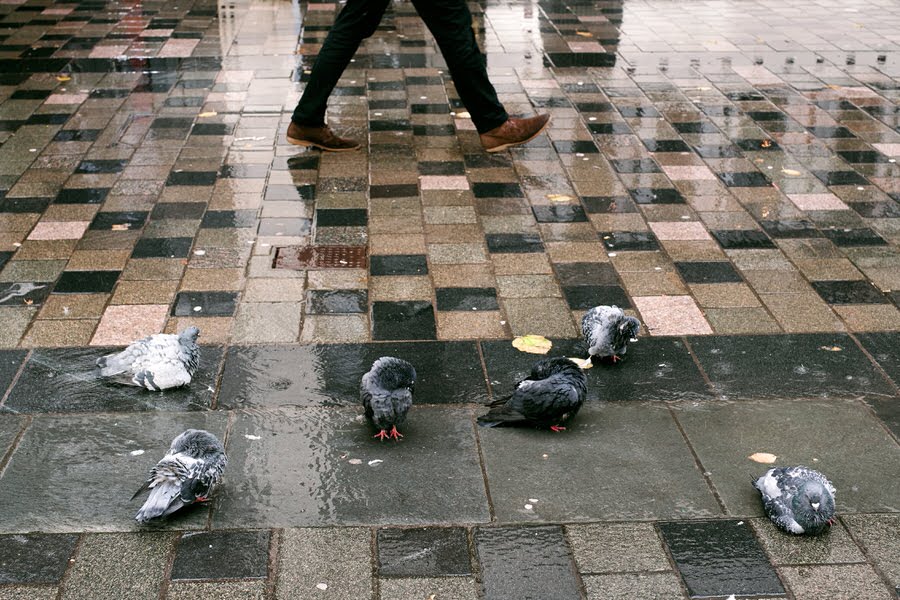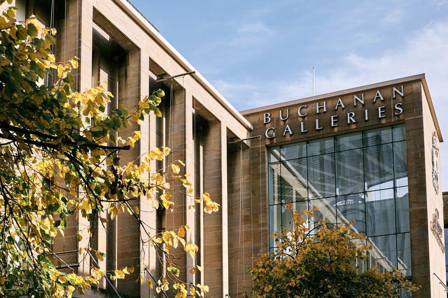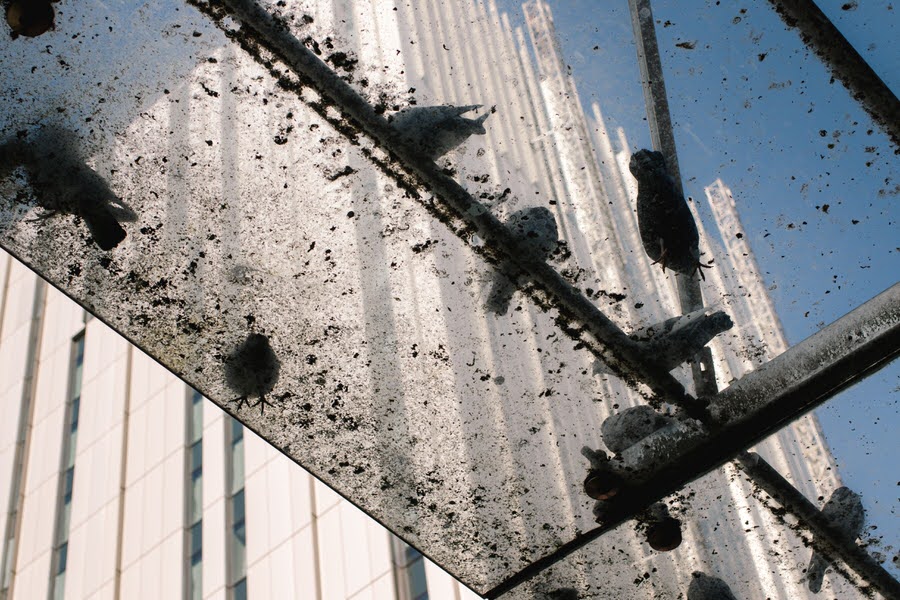 Pigeons perched on the dirty glass awning on Sauchiehall Street