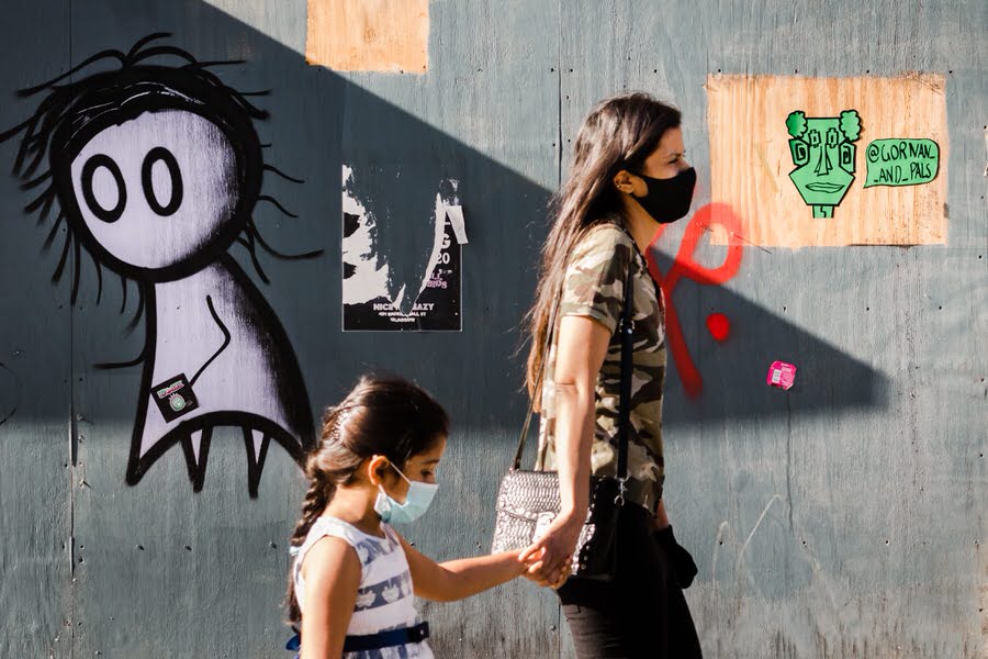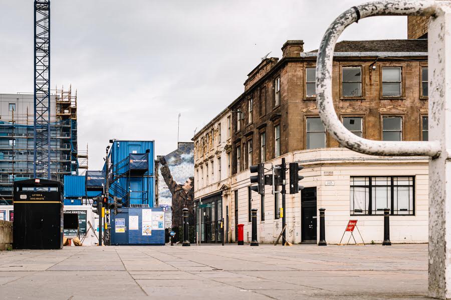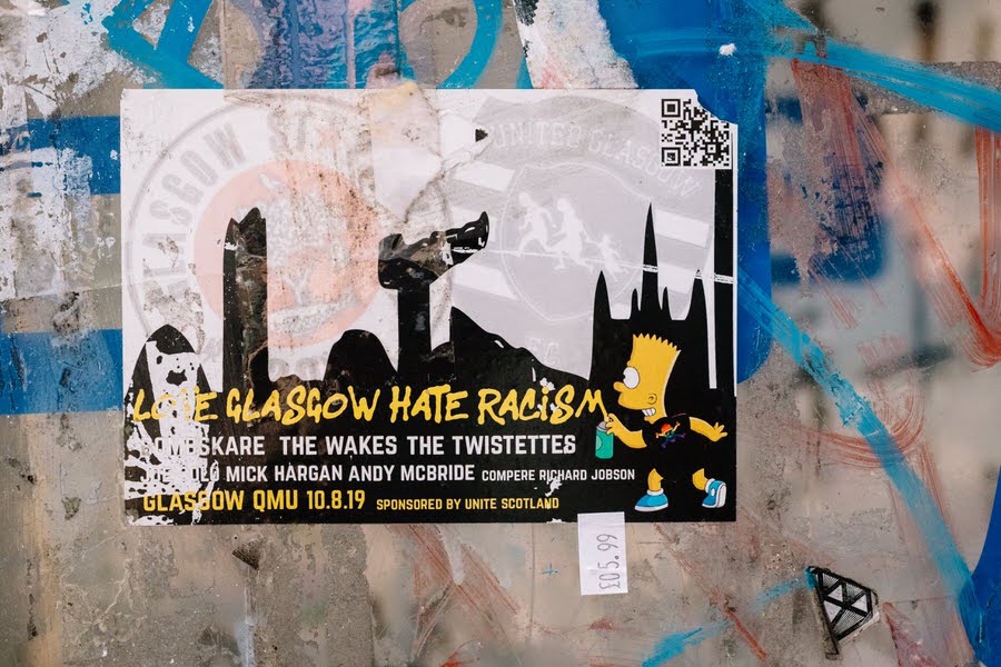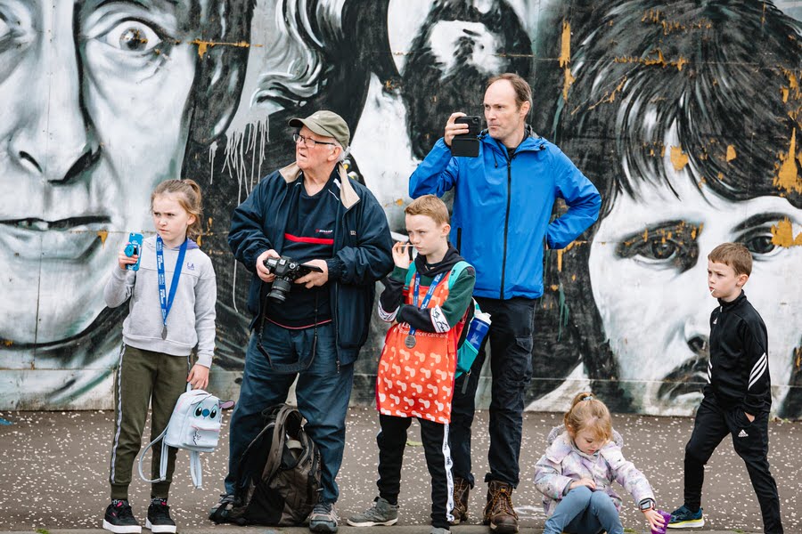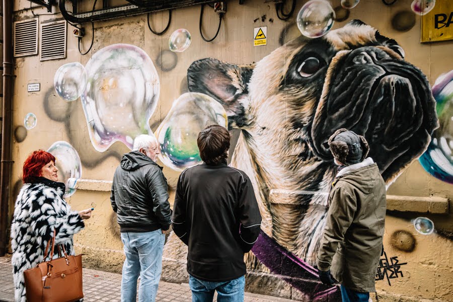 Glasgow Mural Trail pilgrims outside the Bubbles mural by Rogue One