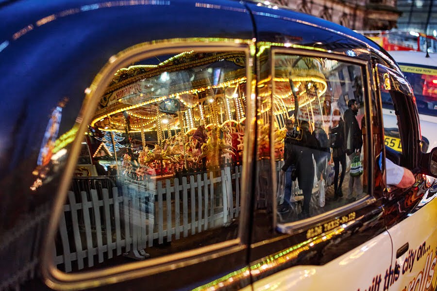 Xmas carousel reflected in the taxi outside George Square, Glasgow
