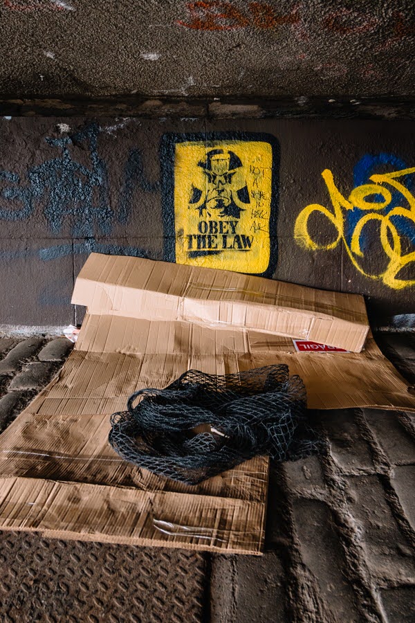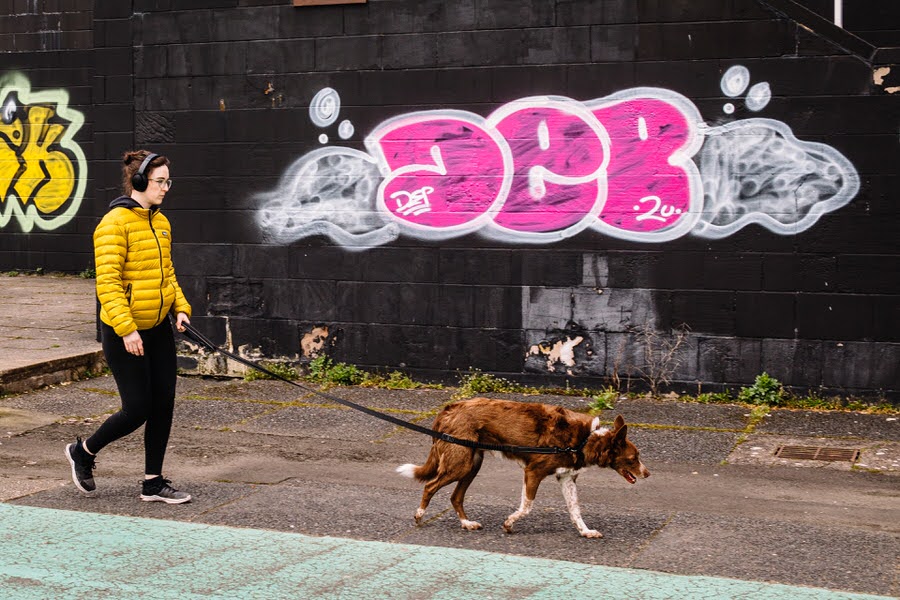 Puffed throwup graffiti shapes and a dog walker puffed jacket on Clyde Walkway